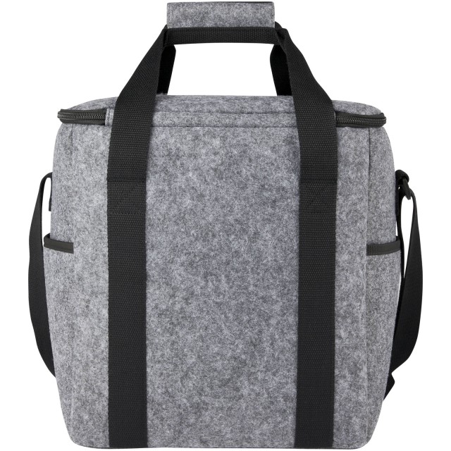 Velká chladicí taška vyrobená z vysoce kvalitní měkké a odolné recyklované plsti s certifikací GRS. Obsahuje velkou hlavní přihrádku (šest 1,5litrových lahví) s potravinově nezávadnou a extra silnou tepelnou izolací PEVA s vysokou tepelnou hustotou, která udrží nápoje a občerstvení studené po dlouhé hodiny. Horní zapínání na zip, přední kapsa a dvě boční kapsy pro další úložný prostor. Nastavitelné dlouhé bavlněné tkané ramenní popruhy (55 x 3,8 cm) a 2 tkané bavlněné rukojeti (25 x 3,8 cm) s horním zapínáním na suchý zip. Snadné čištění. Kapacita: 21 litrů.