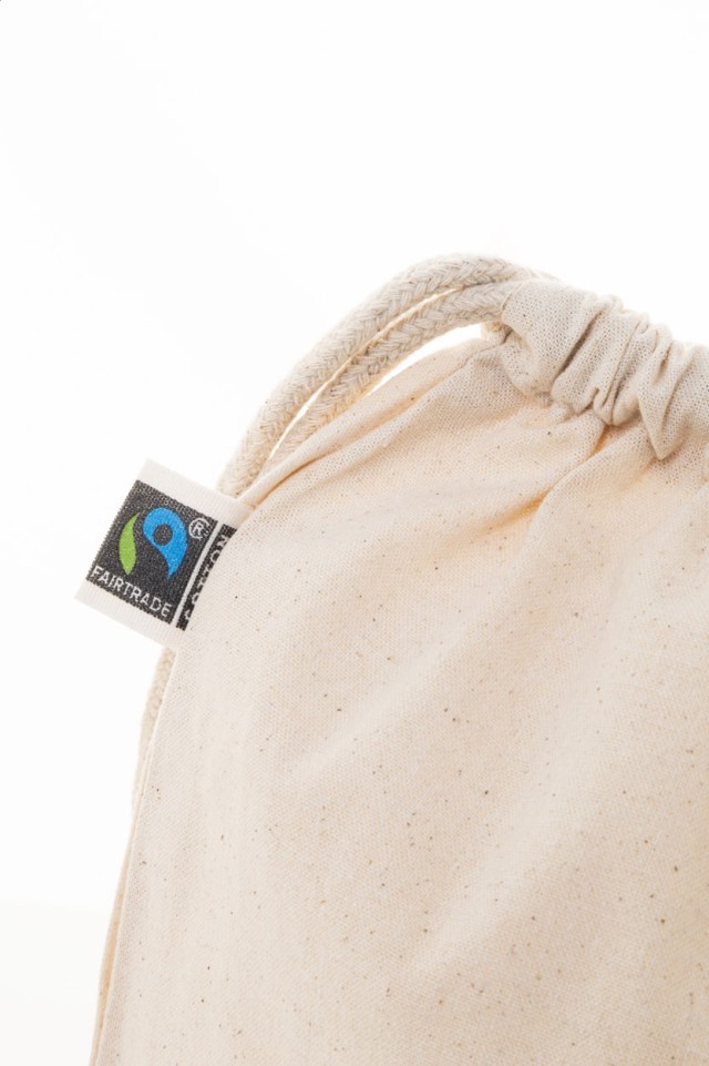 Fairtrade bavlněný vak se stahovací šňůrkou s výraznou Fairtrade etiketou. 100% Fairtrade bavlna, 180 g/m².