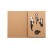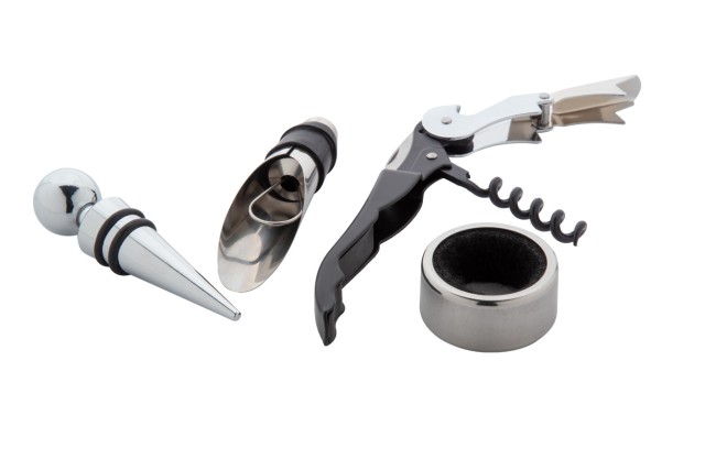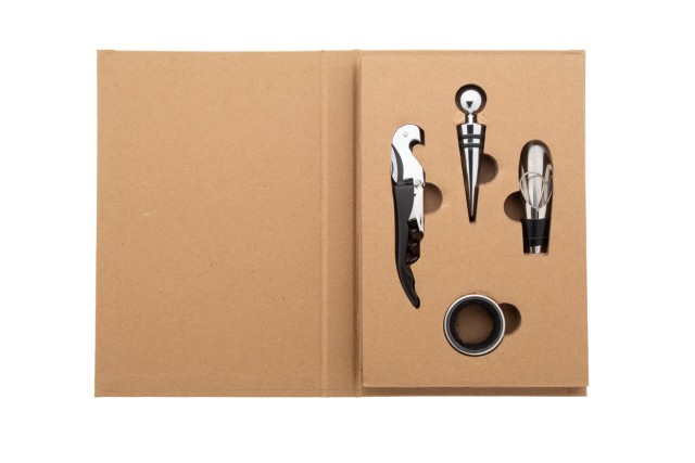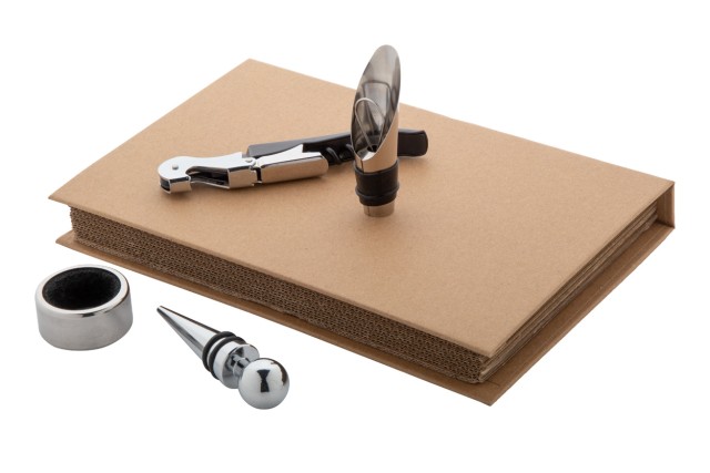 4dílná sada na víno z nerezové oceli v krabičce ve tvaru knihy z recyklovaného kraftového papíru. Včetně vývrtky, zátky, nálevky a kroužku na kapy.