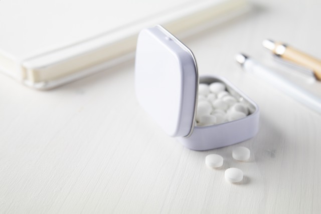 Obdélníková kovová krabička s cca. 25 gramů mmentolových bonbónů.