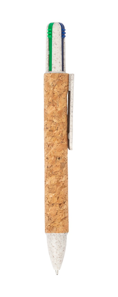 Ekologické plastové kuličkové pero z pšeničné slámy s pouzdrem potaženým přírodním korkem. Se 4 barevnými náplněmi: černá, modrá, zelená a červená.