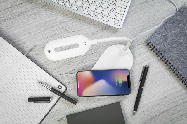Multifunkční stolní lampa z recyklovaného ABS se zabudovanou bezdrátovou rychlonabíječkou (15W). S 10 LED diodami, dotykovým tlačítkem a nastavitelným jasem. Včetně USB nabíjecího kabelu.