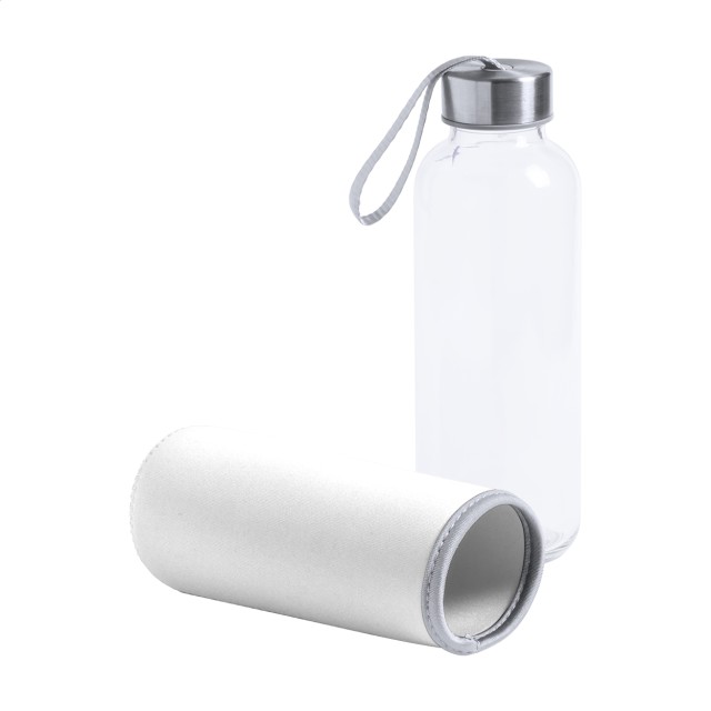 Skleněná láhev s popruhem na uzávěru a barevným neoprenovým krytem. 420 ml. Nevhodné pro sycené nápoje.