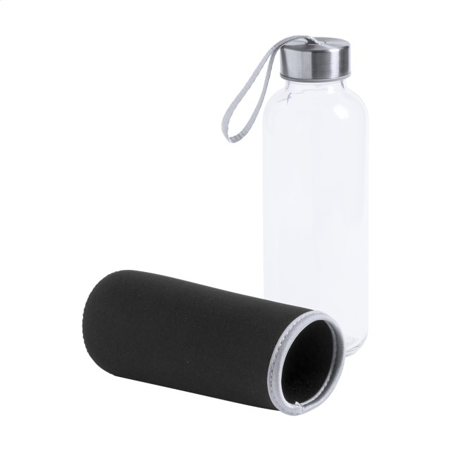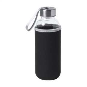 Skleněná láhev s popruhem na uzávěru a barevným neoprenovým krytem. 420 ml. Nevhodné pro sycené nápoje.
