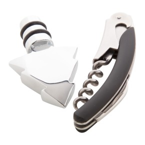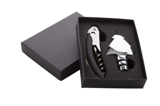 Sada na víno s vývrtkou a zátkou ve tvaru vánočního stromečku, v černé dárkové krabičce.