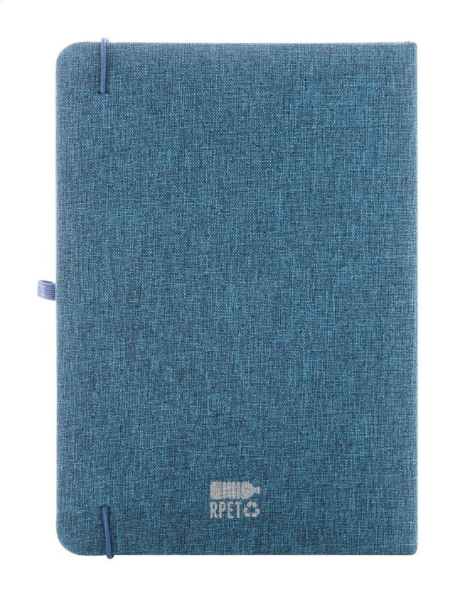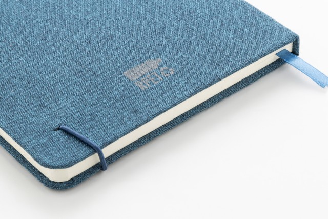 Blok A5 potažený polyesterem 300D RPET s 80 čistými listy. S gumovým páskem, záložkou a držákem na pero.