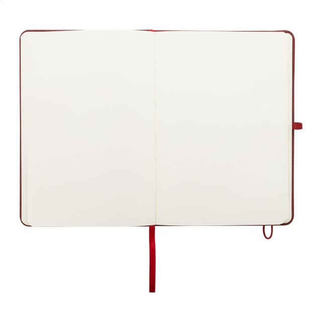 Blok A5 potažený polyesterem 300D RPET s 80 čistými listy. S gumovým páskem, záložkou a držákem na pero.