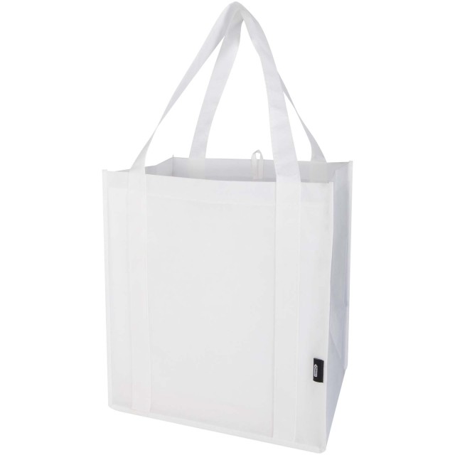 Recyklovaná nákupní taška Liberty s certifikací GRS vyrobená z odolného netkaného RPET má podpůrnou spodní desku, díky níž je univerzální a pevná. Nákupní taška má velkou hlavní přihrádku a ucha o délce 25 cm. Objemová kapacita: 29 litrů. Nosnost do 12 kg.