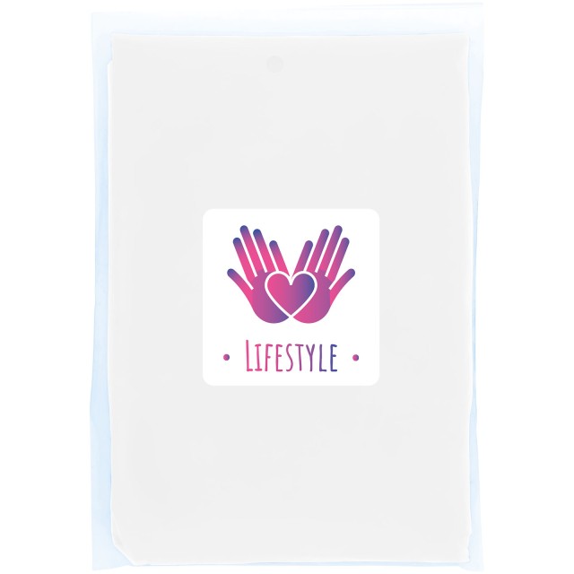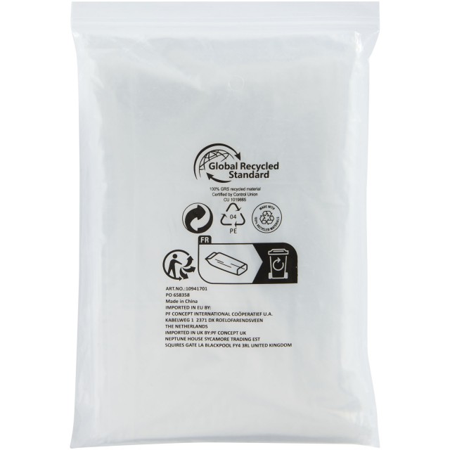 Pončo Mayan je jednorázové pončo do deště univerzální velikosti vyrobené ze 100 % GRS certifikovaného plastu. Toto průhledné pončo s kapucí je ideální mít k dispozici, když vás zastihne bouřka během venkovního festivalu nebo jakékoli jiné venkovní akce. Dodáváno s pouzdrem, které je vhodné pro nanesení potisku. Velikost: 90 x 120 cm.
