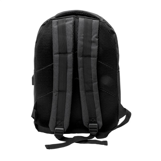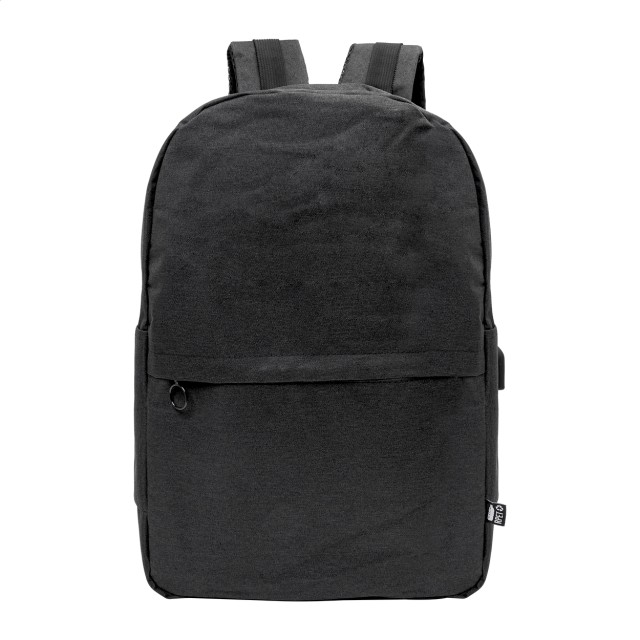 Batoh s přihrádkami na zip, polstrovaným prostorem pro notebook (15 ") a tablet (10"), polstrovanými zady a ramenními popruhy. Se zabudovaným USB připojením pro power banky. 600D RPET polyester, s etiketou s označením RPET.
