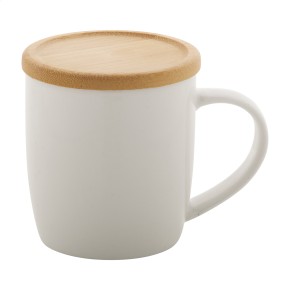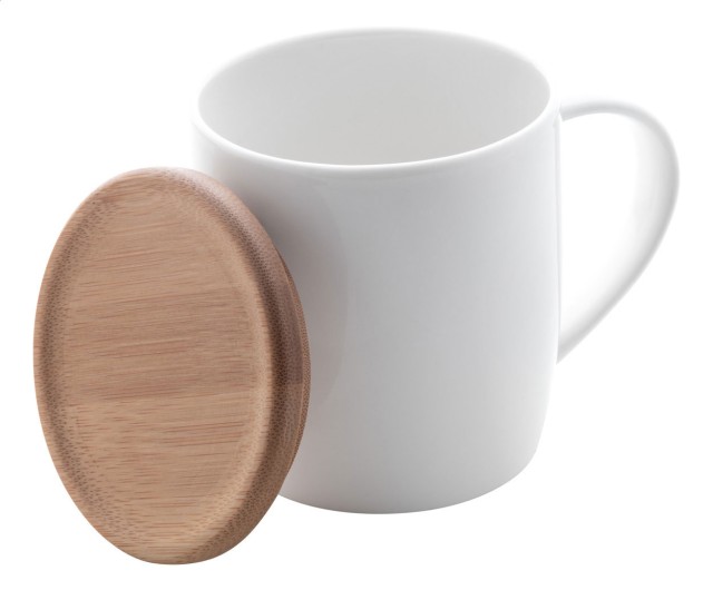 Vysoce kvalitní porcelánový hrnek v bílé barvě s bambusovým podtáckem, 320 ml. V dárkové krabičce.