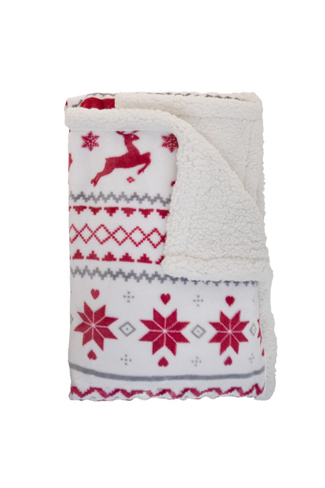 Dvouvrstvá vánoční deka ze 230 g/m² flanelového fleecu RPET a oboustrannou podšívkou z RPET sherpa fleecu 210 g/m². Zabalené do stuhy a potisknutelné papírové karty.