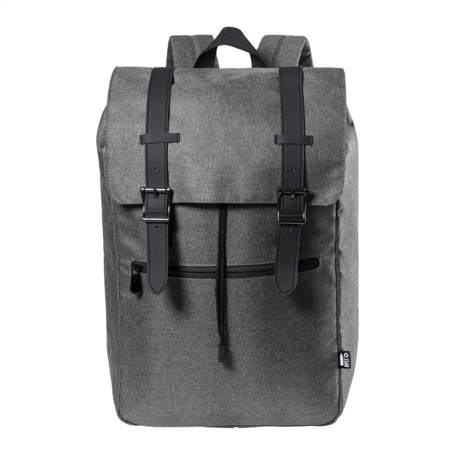 RPET batoh s polstrovanou přihrádkou na notebook (15") a tablet (12"), přední kapsou na zip, polstrovanými zády a ramenními popruhy. Hlavní komora se stahovací šňůrkou a magnetickým zapínáním na knoflík. Polyester 300D RPET. S výrazným štítkem RPET.