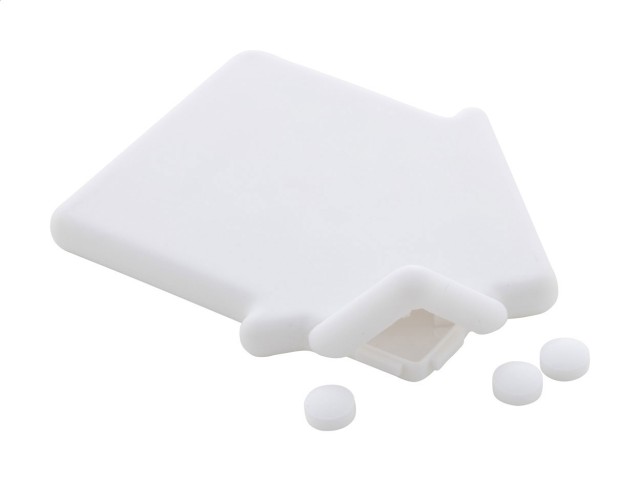 Plastový dávkovač mintových bonbónů ve tvaru domečku s cca. 8 gramů mentolových bonbonů bez cukru.