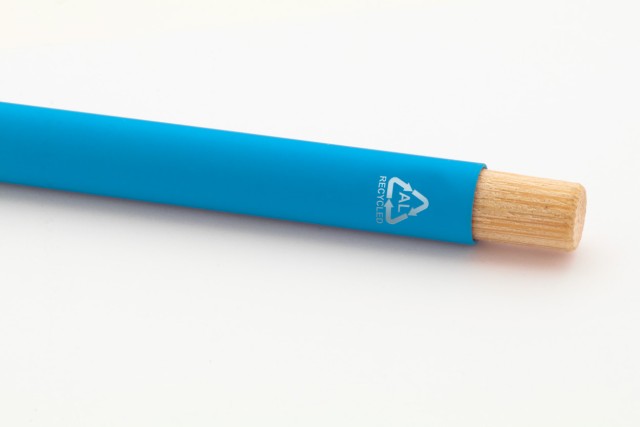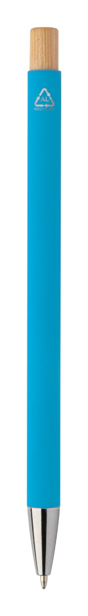 Kuličkové pero z recyklovaného hliníku s pogumovaným povrchem a bambusovým tlačítkem a chromovými detaily. Se speciální vrstvou pro zrcadlové laserové gravírování. S modrou náplní.