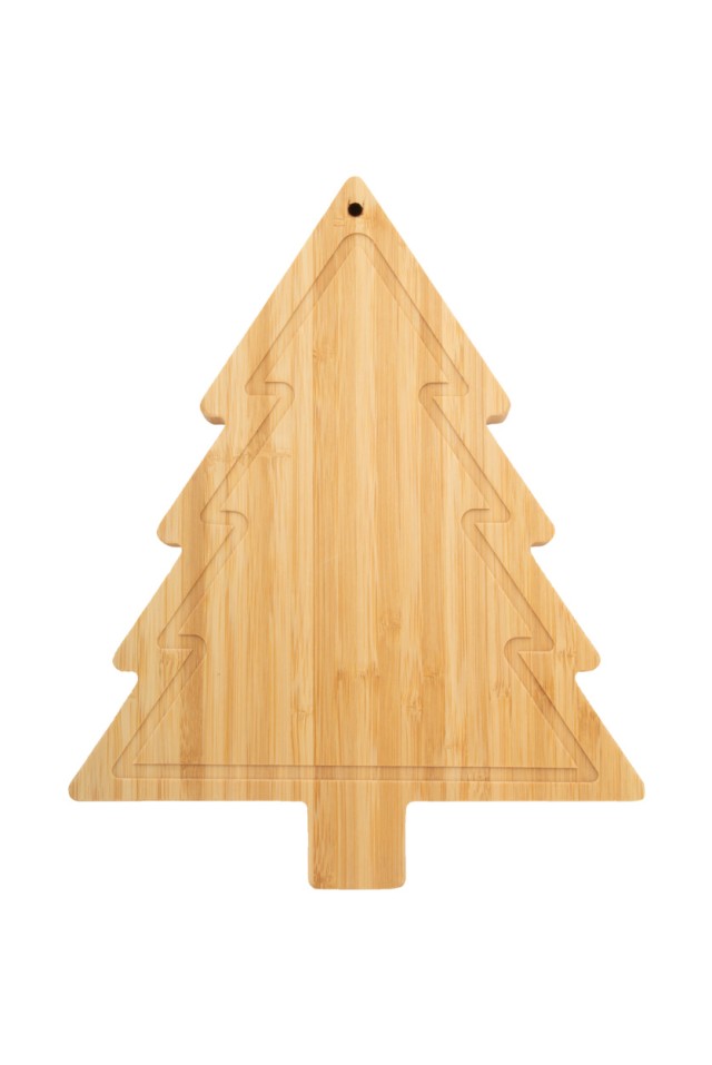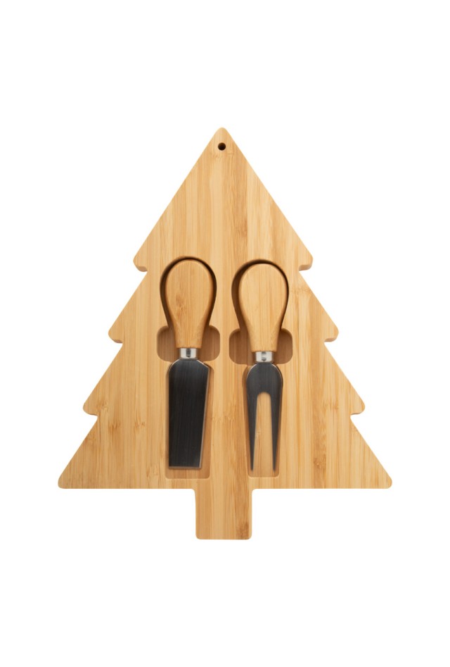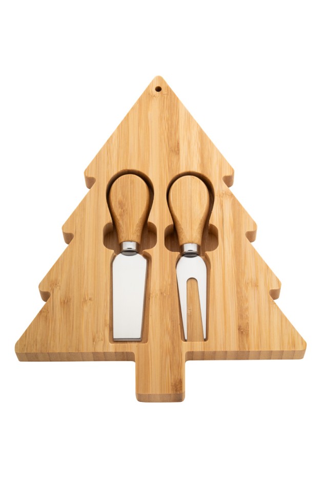 Sada bambusových nožů na sýr ve vánočním designu s prkénkem ve tvaru vánočního stromku a 2 nerezovými noži na sýr. V kraftové papírové krabici.