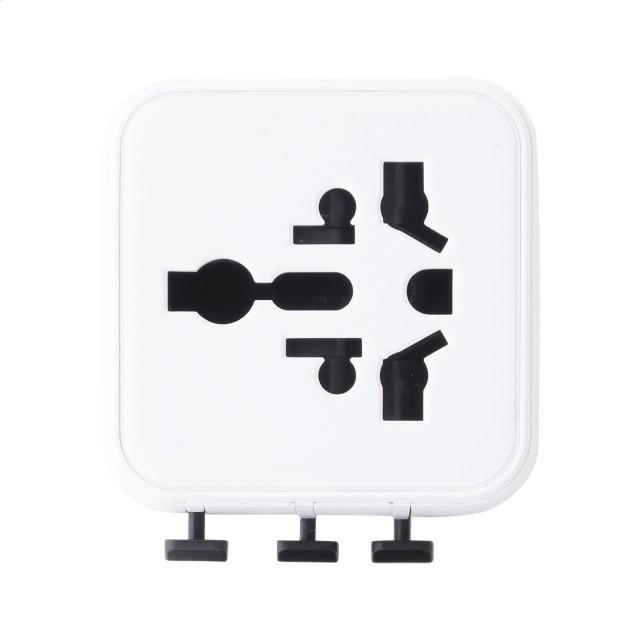 Ultra kompaktní, univerzální celosvětový cestovní adaptér z recyklovaného PC plastu, se zabudovanými zástrčkami pro USA, Evropu, Velkou Británii a Austrálii.