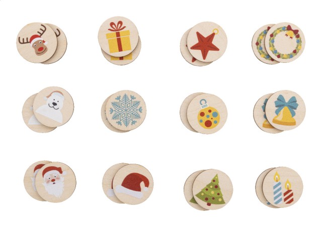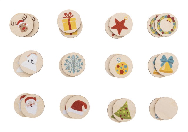 Pexeso z laminované březové překližky s vánočními motivy v bavlněném pytlíku. S 24 dlaždicemi (ø35 mm).