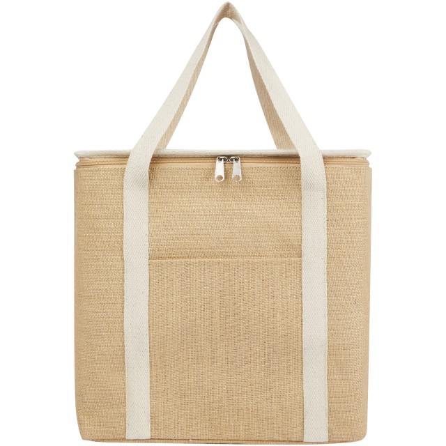 Velká chladicí taška Juta je vyrobena z pevné laminované juty odolné proti opotřebení. Disponuje velkou (19litrovou) hlavní přihrádkou, do které se vejde šest 1,5litrových lahví, a je vyložená extra silnou a potravinově nezávadnou hliníkovou izolací, která udrží nápoje, potraviny a občerstvení chladné, suché a chráněné po celé hodiny. Taška má horní zapínání na zip, přední kapsu a 2 bavlněná tkaná ucha na přenášení (50 x 2,5 cm). Vyrobeno v Indii a certifikováno OEKO-TEX®.