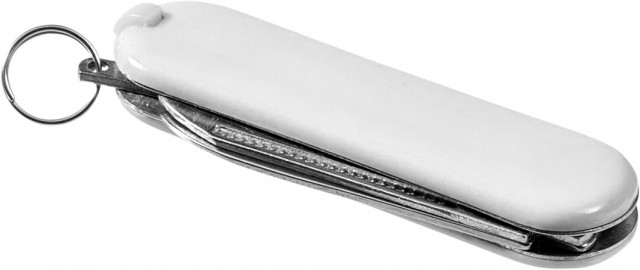 Kapesní nůž s nožem, nůžkami vybavenými pružinou, pinzetou, párátkem, pilníkem na nehty a malým dvojitým kovovým kroužkem na klíče.