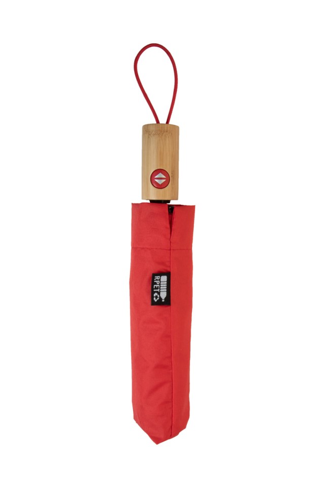 Plně automatický (otevřít/zavřít), větruodolný skládací deštník s 8 panely v pouzdře v odpovídající barvě. S kovovým rámem, sklolaminátovými žebry a bambusovou rukojetí. Pongee 190T RPET. S výrazným štítkem RPET.