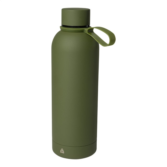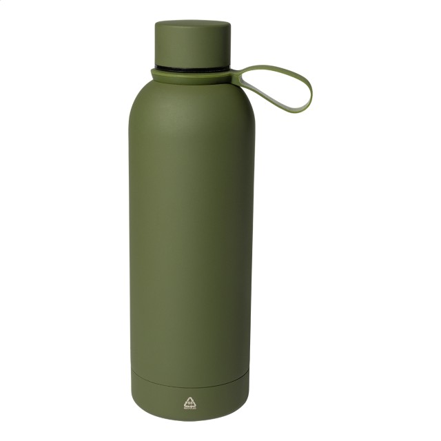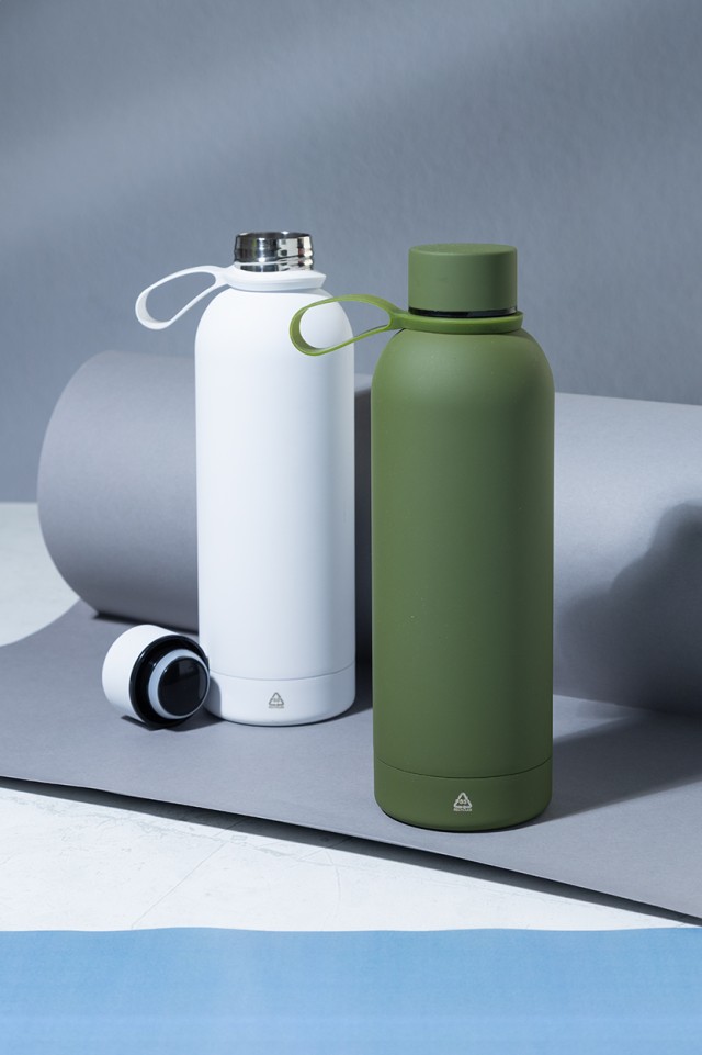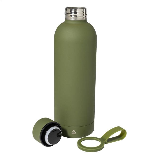 Dvoustěnná vakuová láhev z recyklované nerezové oceli s pogumovanou úpravou a silikonovým páskem, 500 ml.
