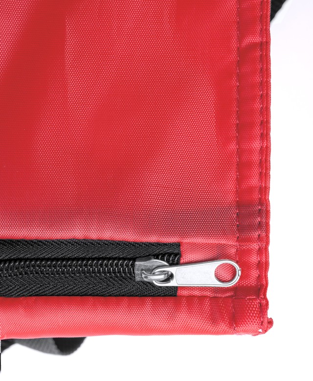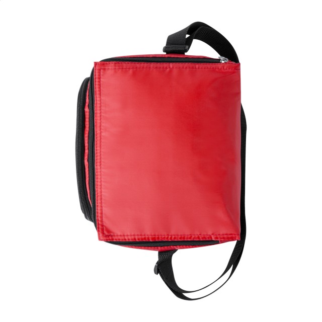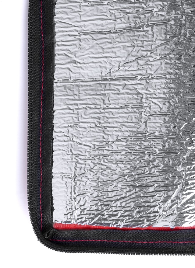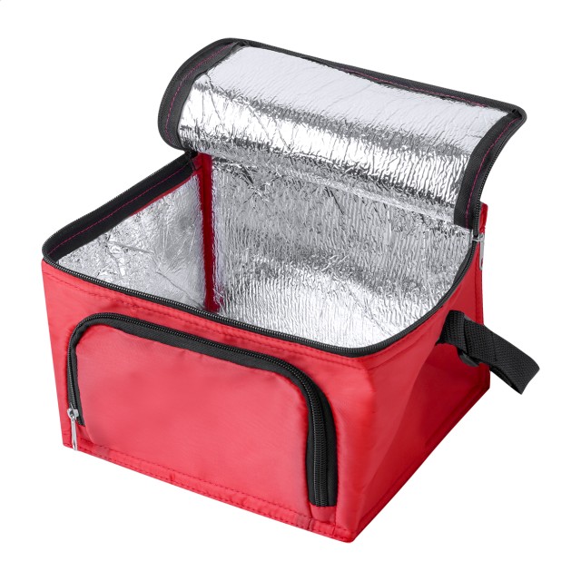 Polyesterová chladicí taška s přihrádkami na zip, hliníkovým polstrováním a ramenním popruhem. Pro 6 ks plechovek 0,33L. 210D polyester.