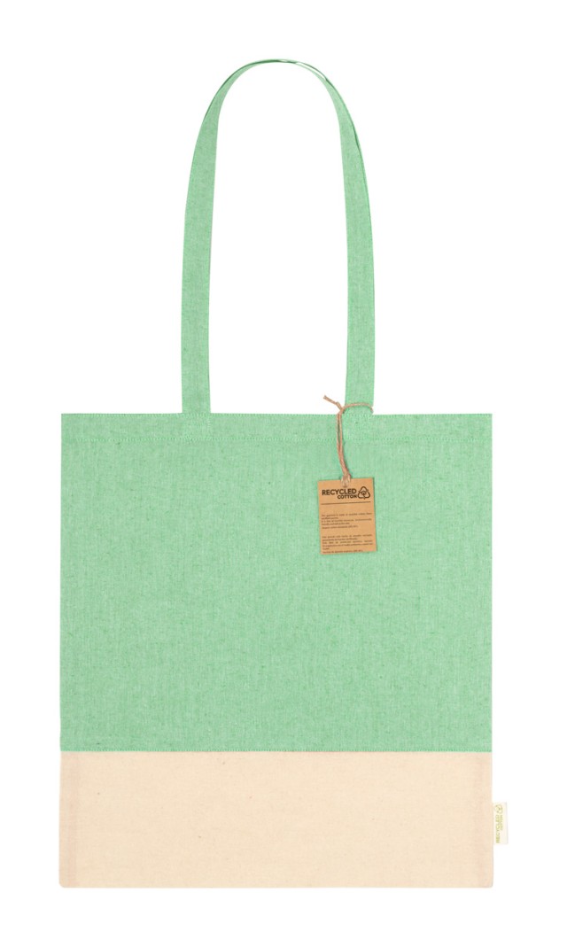 Dvoubarevná nákupní taška z recyklované bavlny s dlouhými uchy a výrazným štítkem z recyklované bavlny. 100% recyklovaná bavlna, 120 g/m².