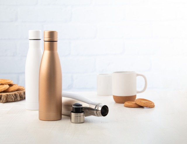 Dvoustěnná nerezová termoska izolovaná mědí, 500 ml. Měděná izolace udrží nápoje horké 12 a studené 24 hodin.
