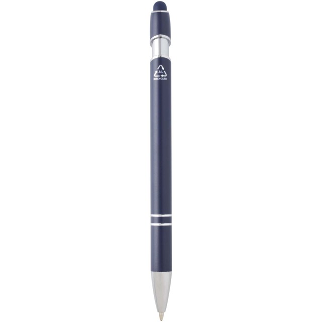 Kuličkové pero Kish se stříbrnou povrchovou úpravou má tělo vyrobené z recyklovaného hliníku a dotykový stylus vyrobený ze silikonu. Snižuje také množství odpadu na skládkách a pomáhá šetřit přírodní zdroje s cílem snížit emise skleníkových plynů. Barva inkoustu: Modrá. Délka psaní: 800 metrů. Rozměr hrotu: 1,0 mm.