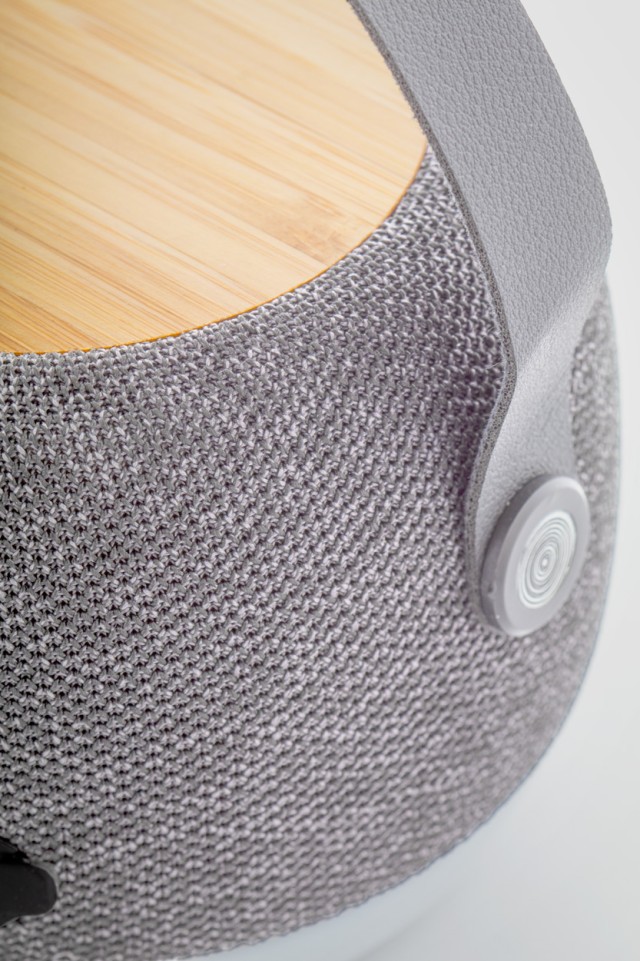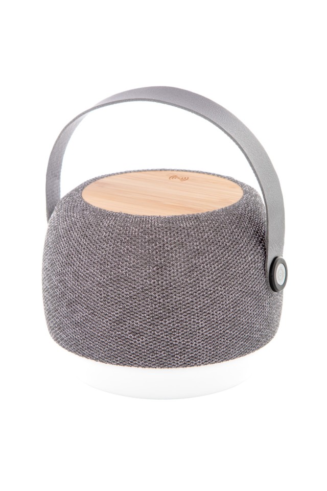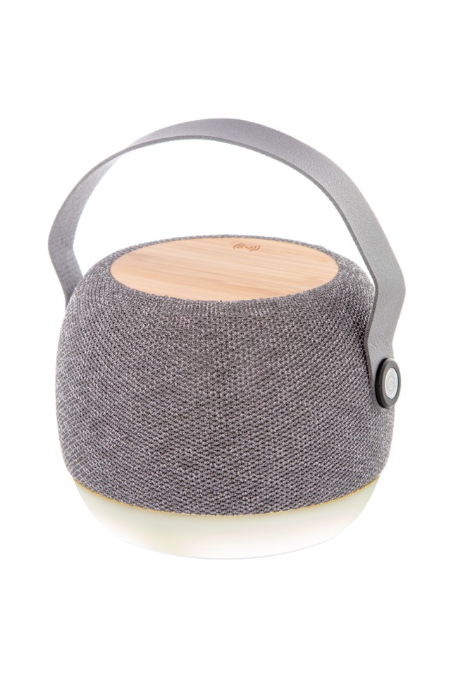 Bezdrátový reproduktor v pouzdře z recyklovaného ABS potaženém tkaninou RPET s LED světlem ve spodní části a bezdrátovou rychlonabíječkou s bambusovou deskou (15 W) v horní části. S koženým řemínkem na přenášení z PU kůže, funkcí hands-free volání a vestavěnou dobíjecí baterií (1200 mAh). Včetně nabíjecího kabelu USB.