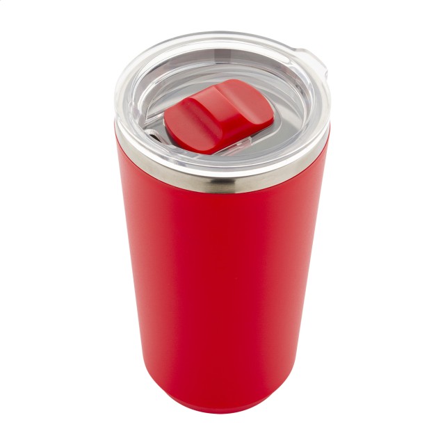 PP plastem pokrytý dvoustěnný, nerezový termo hrnek s víčkem na pití. 500 ml.