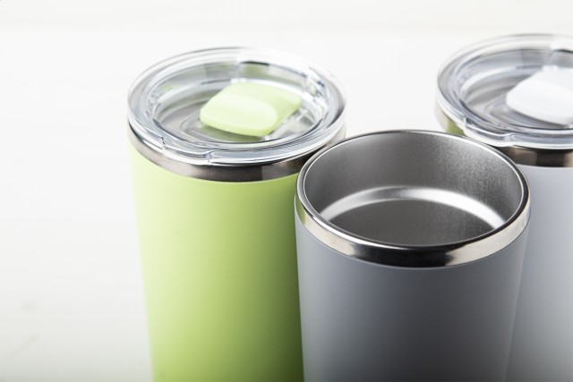 PP plastem pokrytý dvoustěnný, nerezový termo hrnek s víčkem na pití. 500 ml.