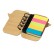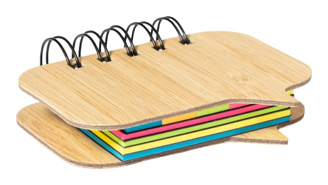 Poznámkový blok ve spirále potažený bambusem se 100 velkými lepicími papírky (ve 4 různých barvách) a 125 značkami stránek (v 5 různých barvách).