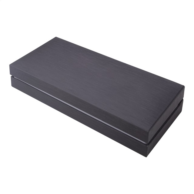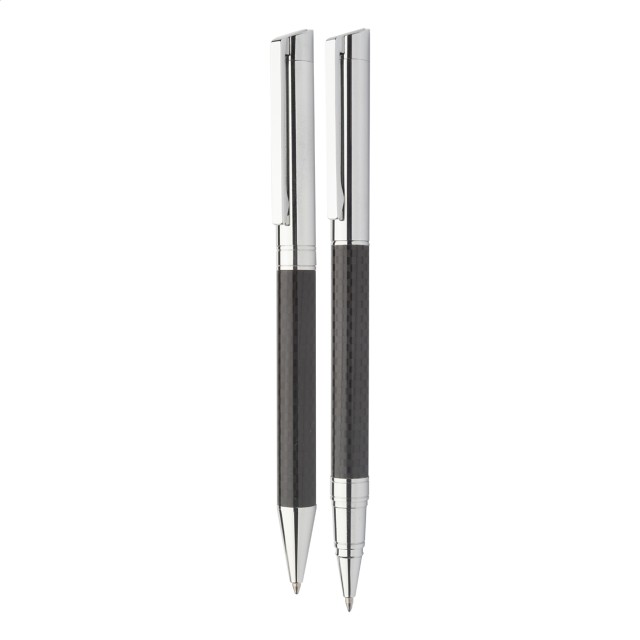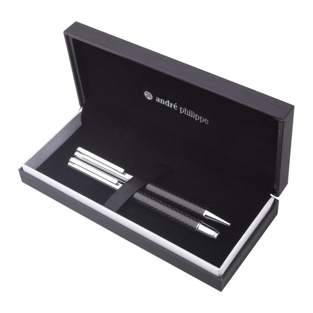 Elegantní sada kovového kuličkového pera a rolleru s karbonovým vzorem a lesklými chromovanými díly. V černé dárkové krabičce, s modrou náplní. Produkt značky André Philippe.