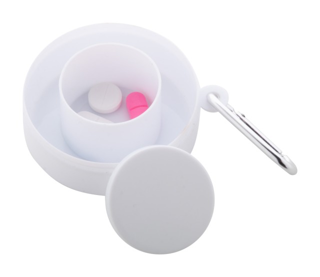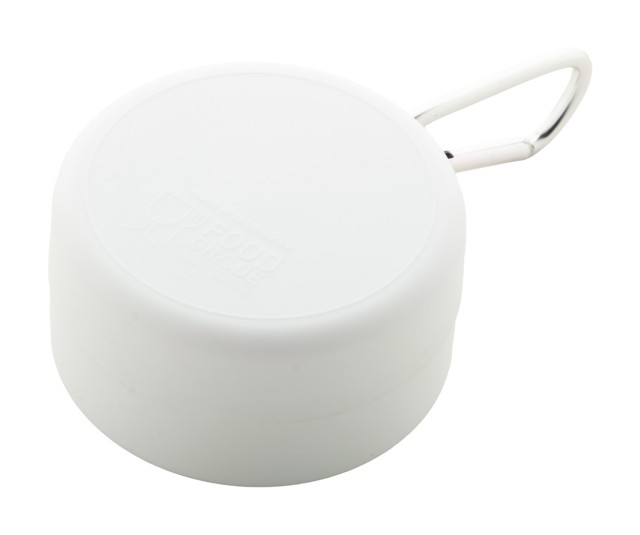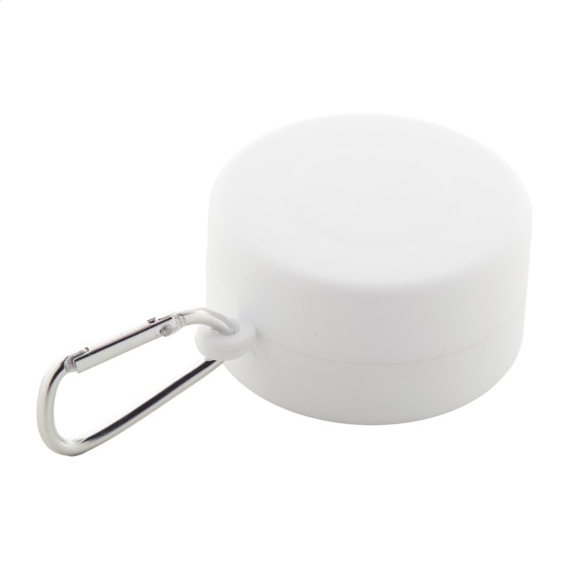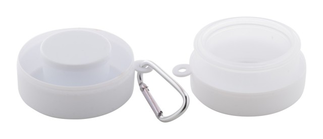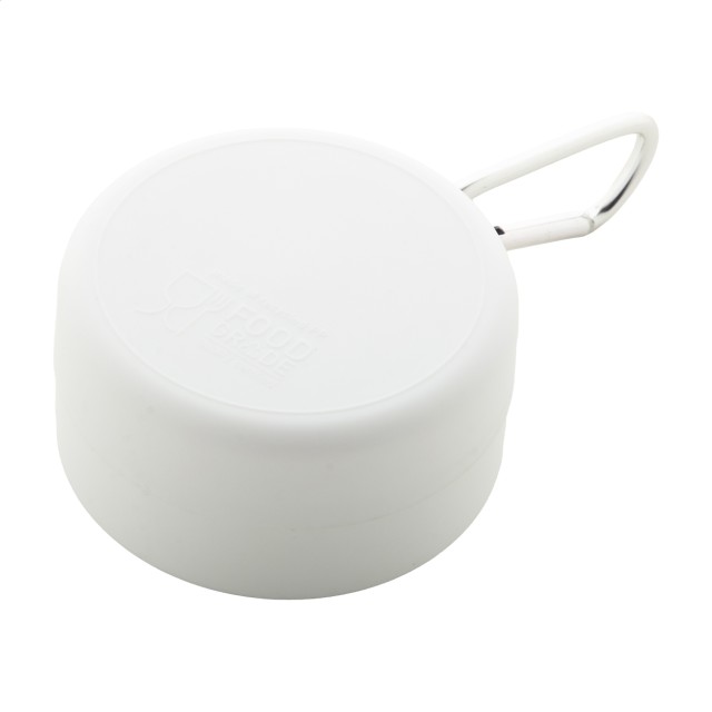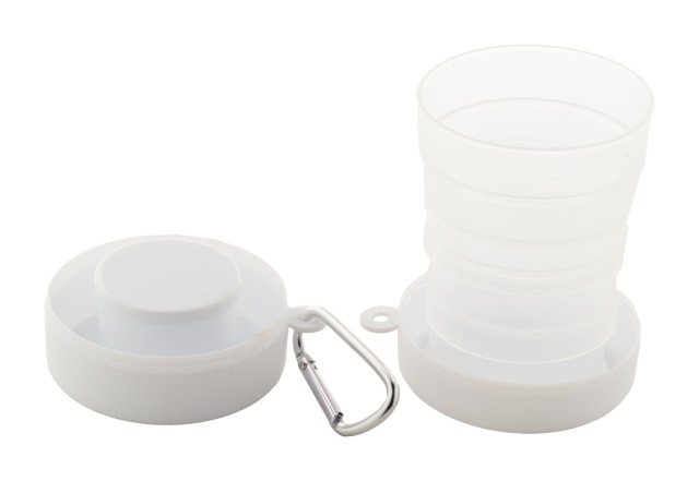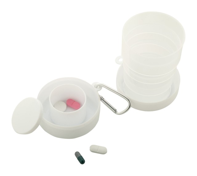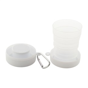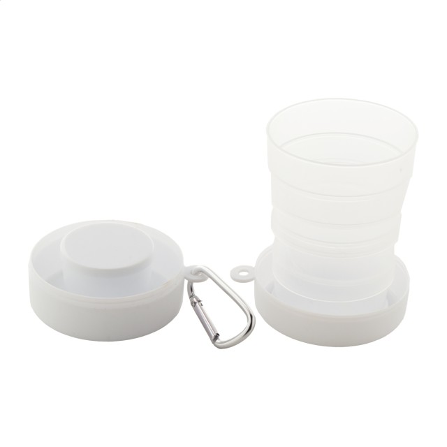 Skládací kelímek z recyklovaného PP plastu s přihrádkou na pilulky a kovovou karabinou. 220 ml. Bez BPA.