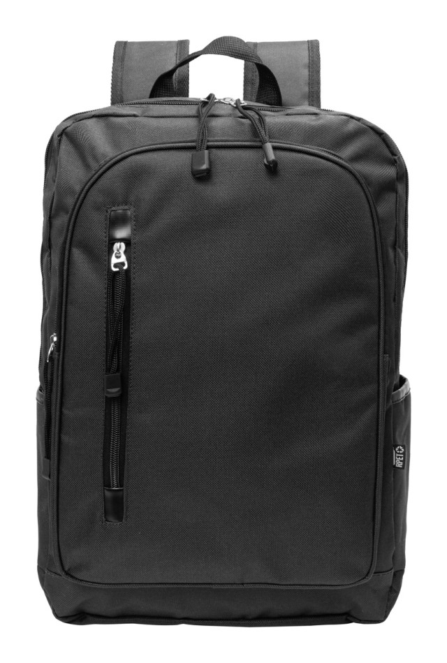 Batoh RPET s hlavním oddílem na zip, 2 předními kapsami na zip, bočními kapsami a polstrovanou přihrádkou na notebook (15"). S polstrovanými zády a ramenními popruhy. Polyester 600D RPET, s výrazným štítkem RPET.