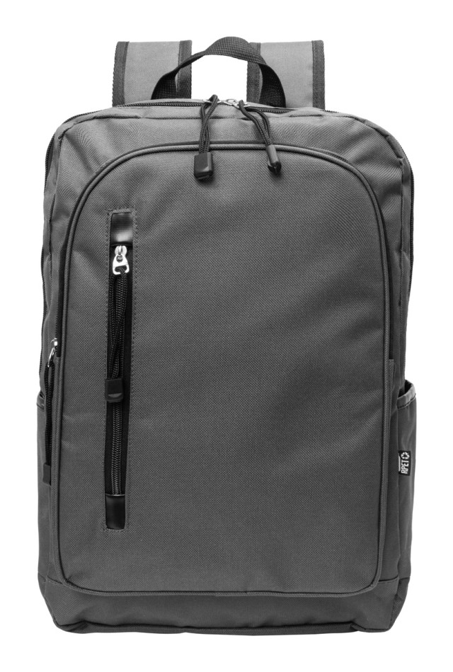 Batoh RPET s hlavním oddílem na zip, 2 předními kapsami na zip, bočními kapsami a polstrovanou přihrádkou na notebook (15"). S polstrovanými zády a ramenními popruhy. Polyester 600D RPET, s výrazným štítkem RPET.