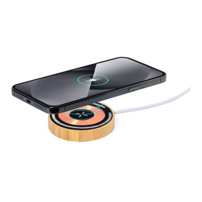 Magnetická bezdrátová rychlonabíječka (15W) v bambusovém a průhledném plastovém krytu s viditelnými elektronickými součástkami. Včetně samolepícího kovového kroužku pro použití magnetické funkce na jakémkoli bezdrátově nabíjecím zařízení. Včetně nabíjecího kabelu USB-C.
