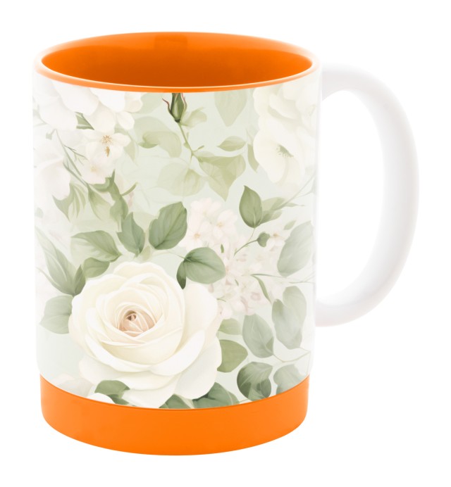 Keramický hrnek na sublimaci s barevným vnitřkem a silikonovým kroužkem v odpovídající barvě, 300 ml. V bílé papírové krabici.