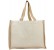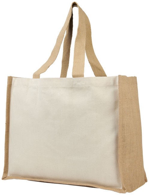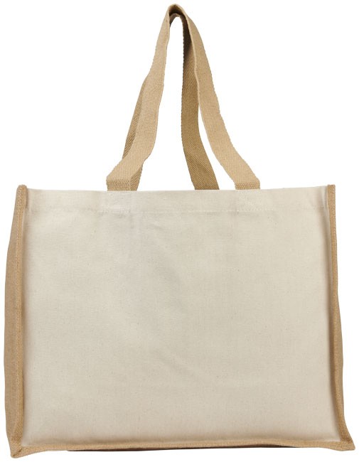Nákupní taška podle nejnovějších trendů s bočními díly z plátna 320 g/m², vhodného pro potisk, s výrazným lemováním z odolné laminované juty a s bavlněnými uchy.