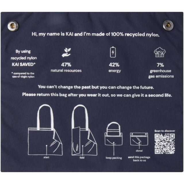 Nákupní taška Kai z recyklovaného GRS – maximální pozitivní vliv na životní prostředí. Udržitelnější budoucnost začíná lepším designem – designem s menším dopadem na životní prostředí. Celkové průměrné snížení dopadu již s 1 taškou je následující: 7 % uhlíkové stopy, 42 % energie a 47 % ekologických nákladů. Taška Kai, vyrobená z recyklovaného GRS nylonu s certifikací 200T, je klasická a nadčasová taška, která je vhodná ke každodennímu používání. Místo určené pro potisk je na kapse, která slouží zároveň jako úložný prostor. Tašku lze vrátit prostřednictvím reklamačního programu pomocí QR kódu, který poskytuje další informace.