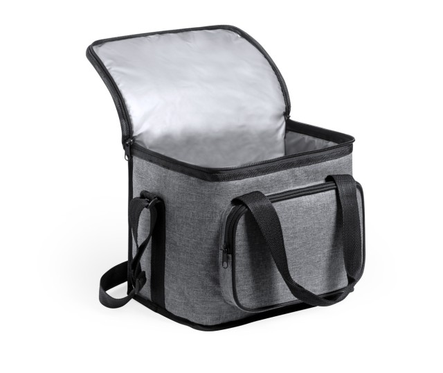 Chladicí taška RPET s polstrováním PEVA, přihrádkami na zip, ucha se suchým zipem a nastavitelným ramenním popruhem. S výrazným štítkem RPET. 600D RPET polyester.