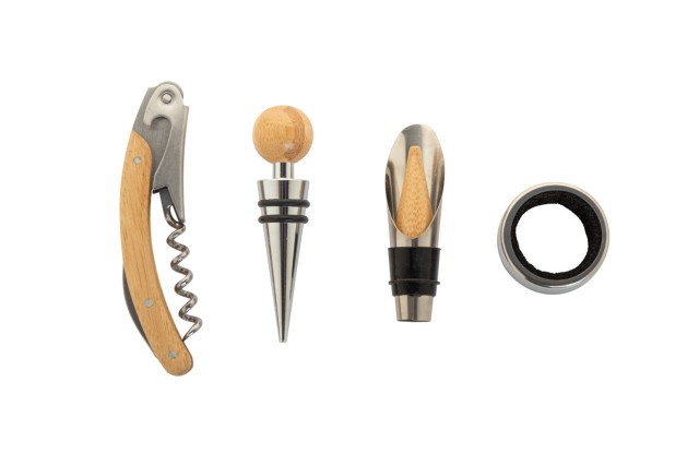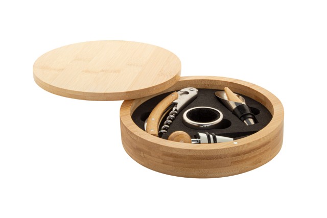 4dílná sada na víno z nerezové oceli vykládaná bambusem v kulaté bambusové krabičce. Včetně vývrtky, zátky, kroužku a nálevky.