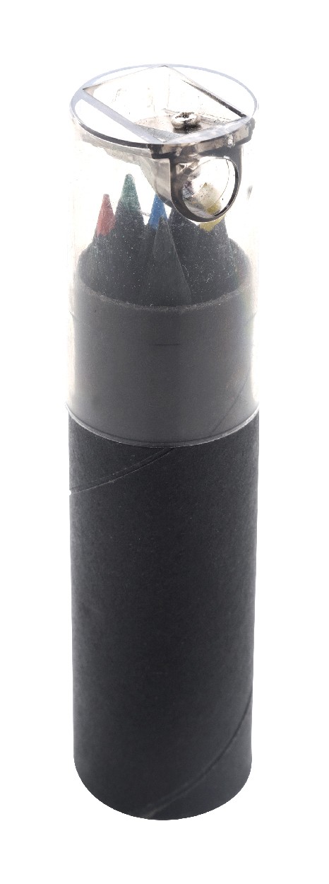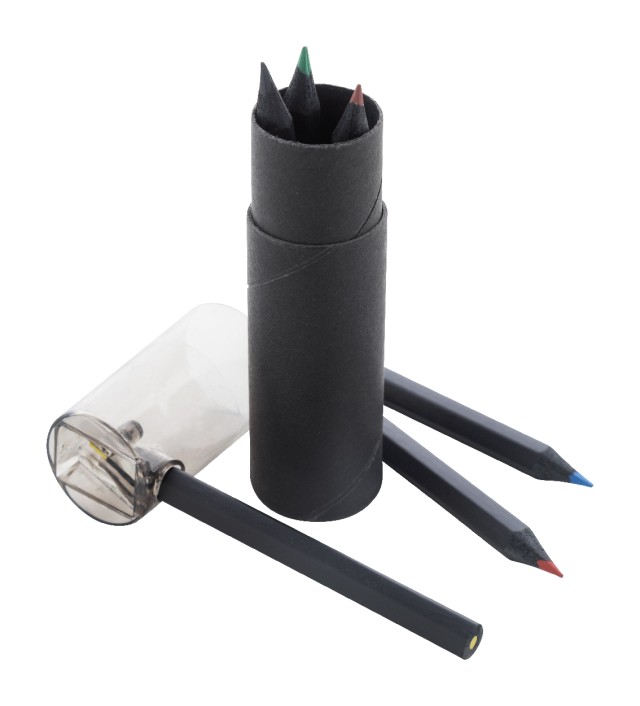 6dílná sada pastelek z černého dřeva v kulatém černém pouzdře z kartonu s plastovým ořezávátkem.