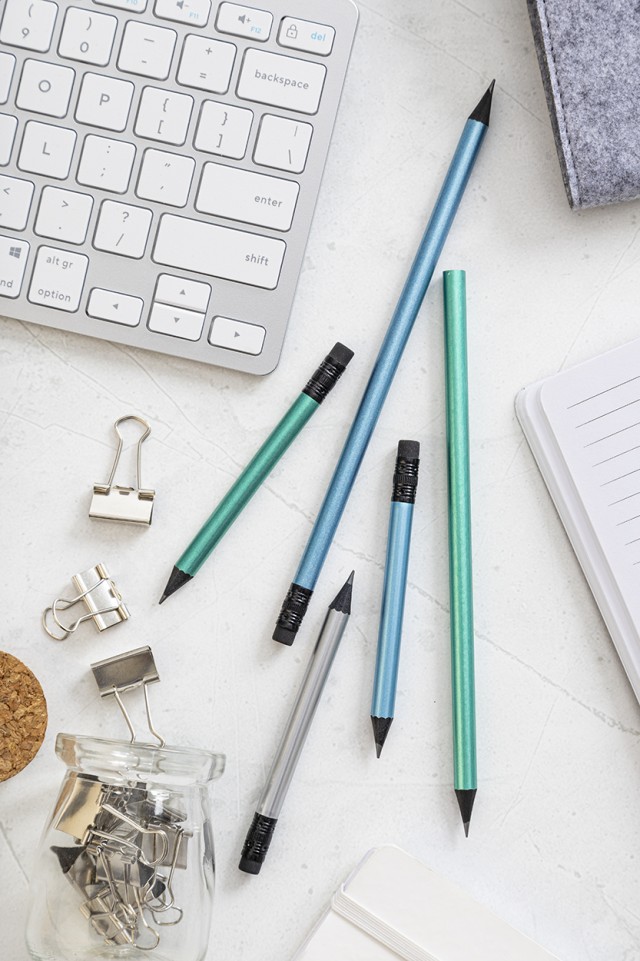 Černá dřevěná mini tužka v metalickém provedení s černou gumou. Ořezaná, třída HB.