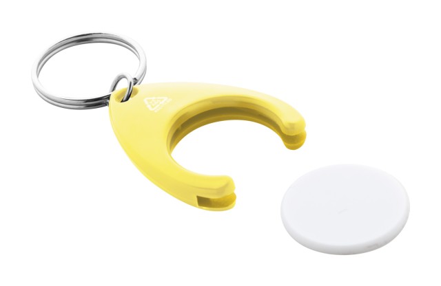 Přívěšek na klíče z recyklovaného ABS a recyklovaného plastu PS se žetonem do nákupního vozíku a kovovým kroužkem. Velikost mince: ø24×2 mm.