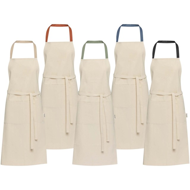 Zástěra Nia je vyrobena ze 100% recyklované bavlny s certifikací GRS s gramáží 200 g/m². Tato zástěra v přírodní bavlněné barvě s krčním úvazem v kontrastní barvě ochrání vaše oblečení při vaření. Zástěra Nia se dvěma kapsami vedle sebe o celkové velikosti 45 × 20 cm a 1 metr dlouhým zádovým úvazem zajišťuje praktičnost i styl v kuchyni.
