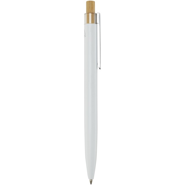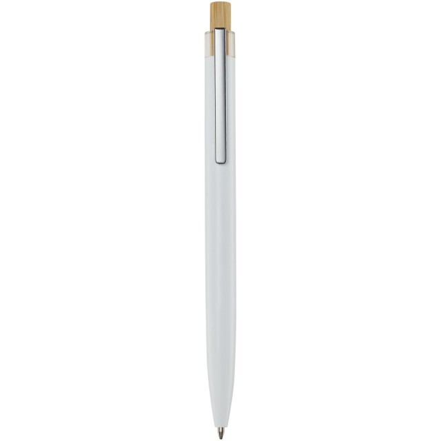 Kuličkové pero Nooshin je vyrobeno z recyklovaného hliníku, což vyžaduje méně energie než výroba hliníku z nerostných surovin. Snižuje také množství odpadu na skládkách a pomáhá šetřit přírodní zdroje s cílem snížit emise skleníkových plynů. Tlačítko je vyrobeno z bambusu. Barva inkoustu: Modrá. Délka psaní: 800 metrů. Rozměr hrotu: 1,00 mm.