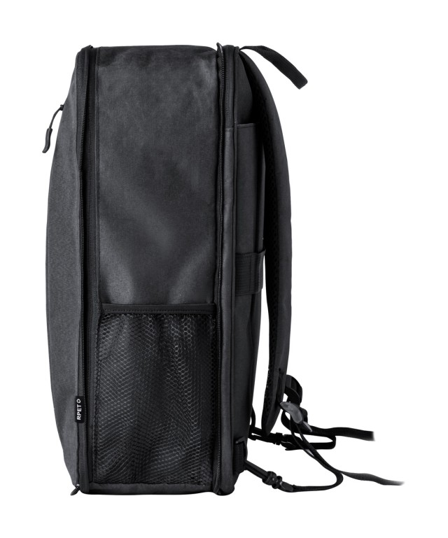 Rozšiřitelný RPET batoh s přihrádkami na zip, polstrovanou přihrádkou na notebook (15") a tablet (10"), polstrovaná záda a ramenní popruhy. 300D RPET polyester s výrazným štítkem RPET.
